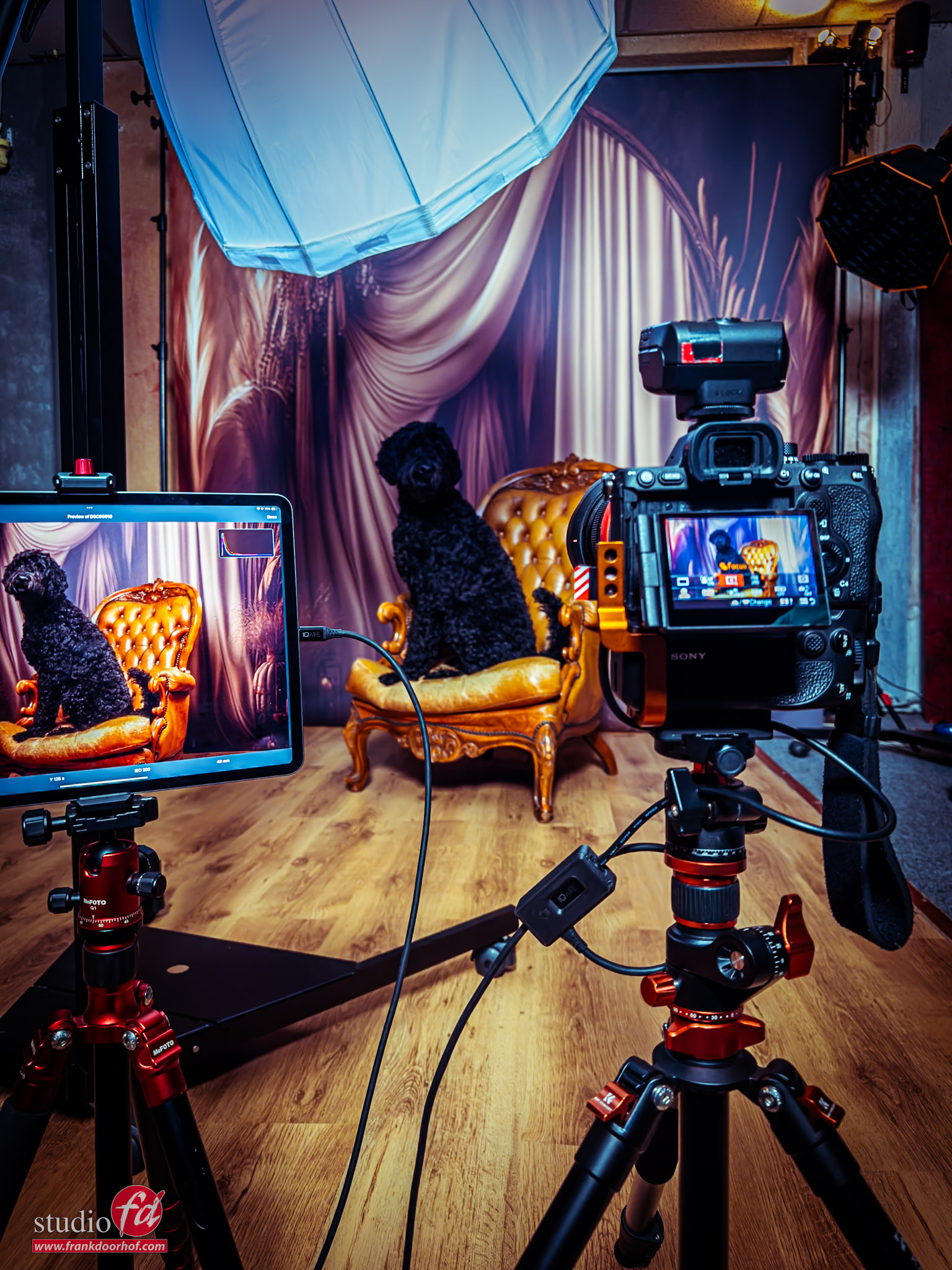 I’m using the Geekoto Lantern as my main light. This is a very nice lightsource to place close to your subject for great detail in for example… a black dog, without getting a real spot effect on the backdrop, so one light to light both the subject and background, by angling the lantern you can control the amount of light hitting the backdrop. It’s super easy.